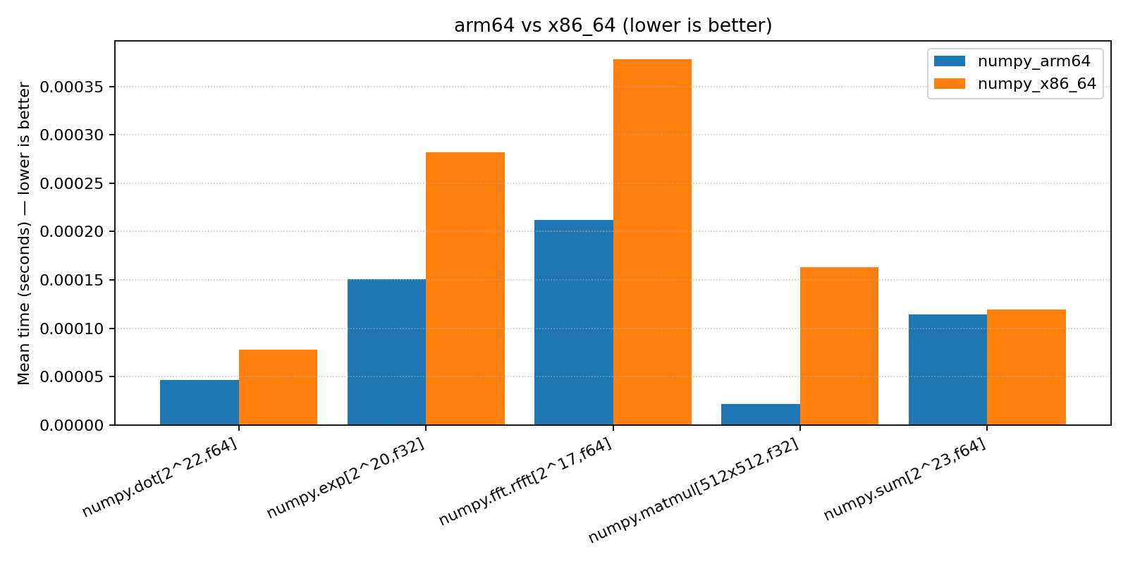 Overall, ARM showed a ~1.5-2x improvement over x86 across most benchmarks.