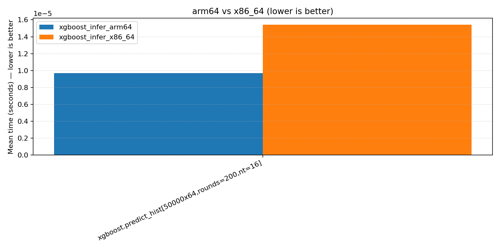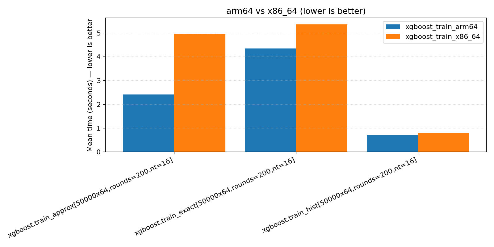 tree_method=hist, which was only a marginal improvement on ARM. I then investigated XGBoost tree methods and learned abouttree_method=exactandtree_method=approx.approxshowed the best improvement, in line with other benchmarks.