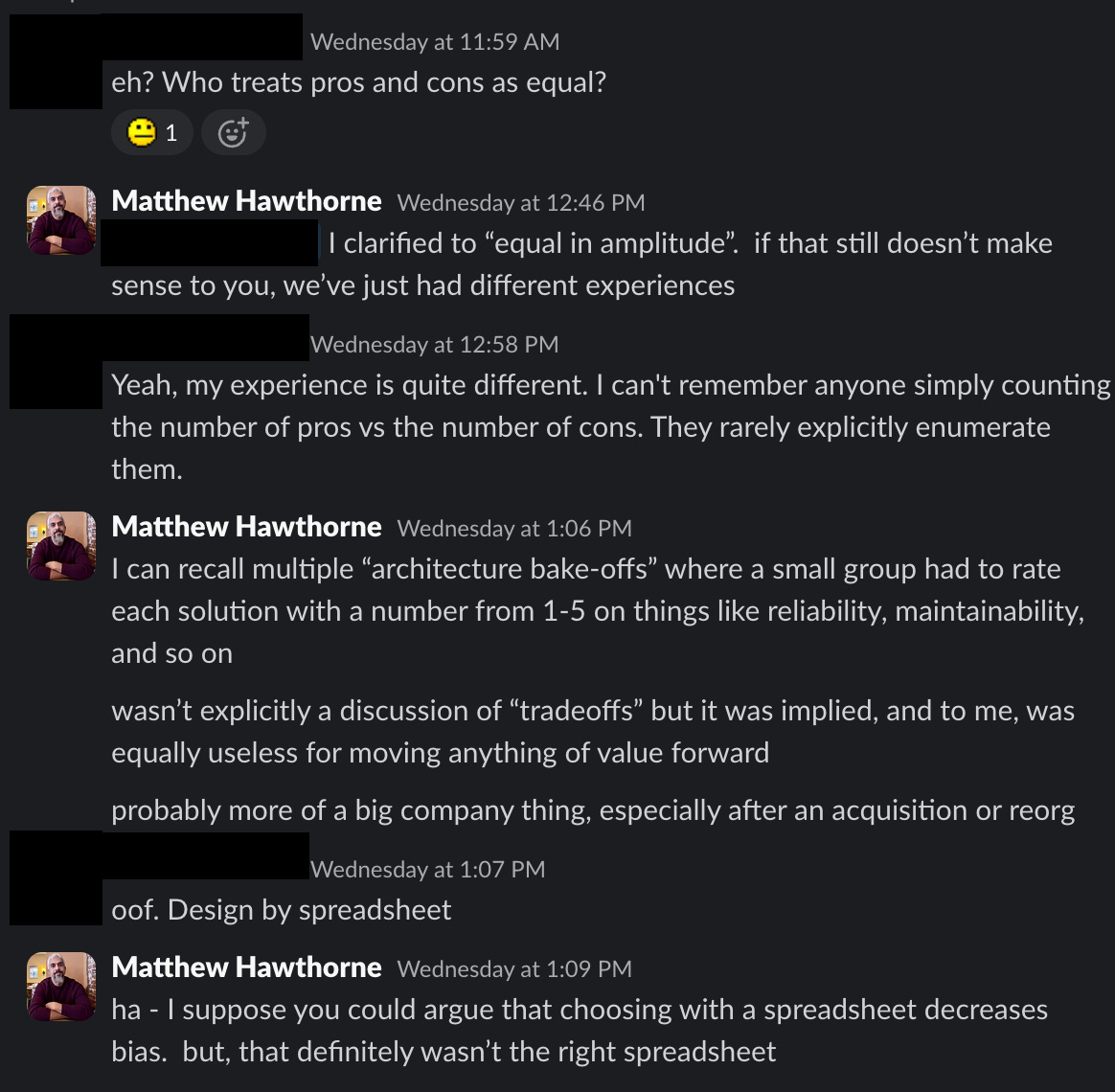 This was in response to my recent post about why I’ve stopped framing technical decisions as tradeoffs:
